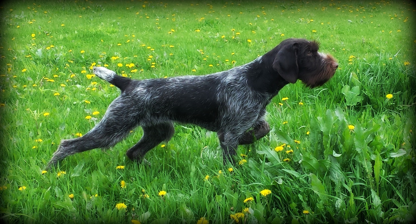 Bisto is THE MAN! Courtney traveled to the UK in 2009 when she had the opportunity to handle Bisto to Best Puppy at the GWP Club Show when he was only 6 months old. When William and Courtney returned back to the UK in March 2012, they had the privelege to watch him work in the field and knew at that point, he would be an asset to their hunting endeavors, and the Claddagh breeding program. Bisto has an incredibly dense, harsh coat with perfect amount of furnishing. He has a ton of drive in the field, and very cooperative, an absolute pleasure to hunt over and train. Bisto is rough tough dog that busts through brush, and breaks through ice, yet is incredibly sweet and gentle, loves to play with our other dogs and children.